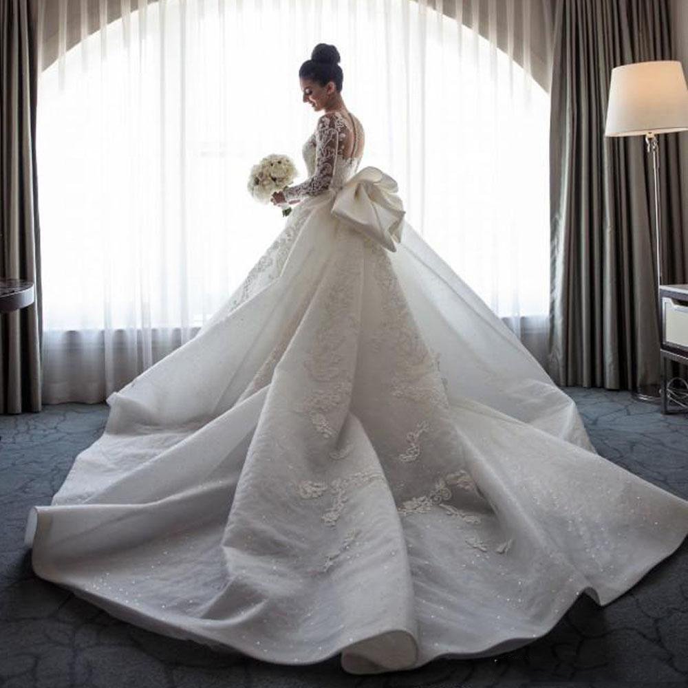 2018 luxe robe de mariée sirène col transparent manches longues dentelle appliques arc survêtements chapelle Train robe de mariée Vestido de noiva