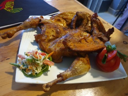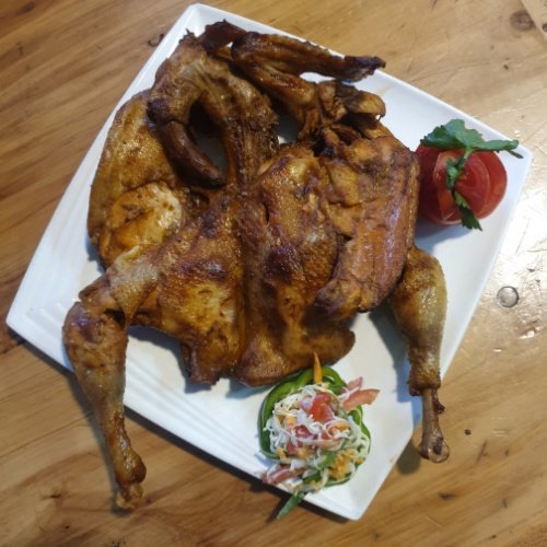 Poulet colonel entier grillé à la braise. Avec accompagnement